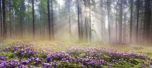 Magic Carpathian forest at dawn